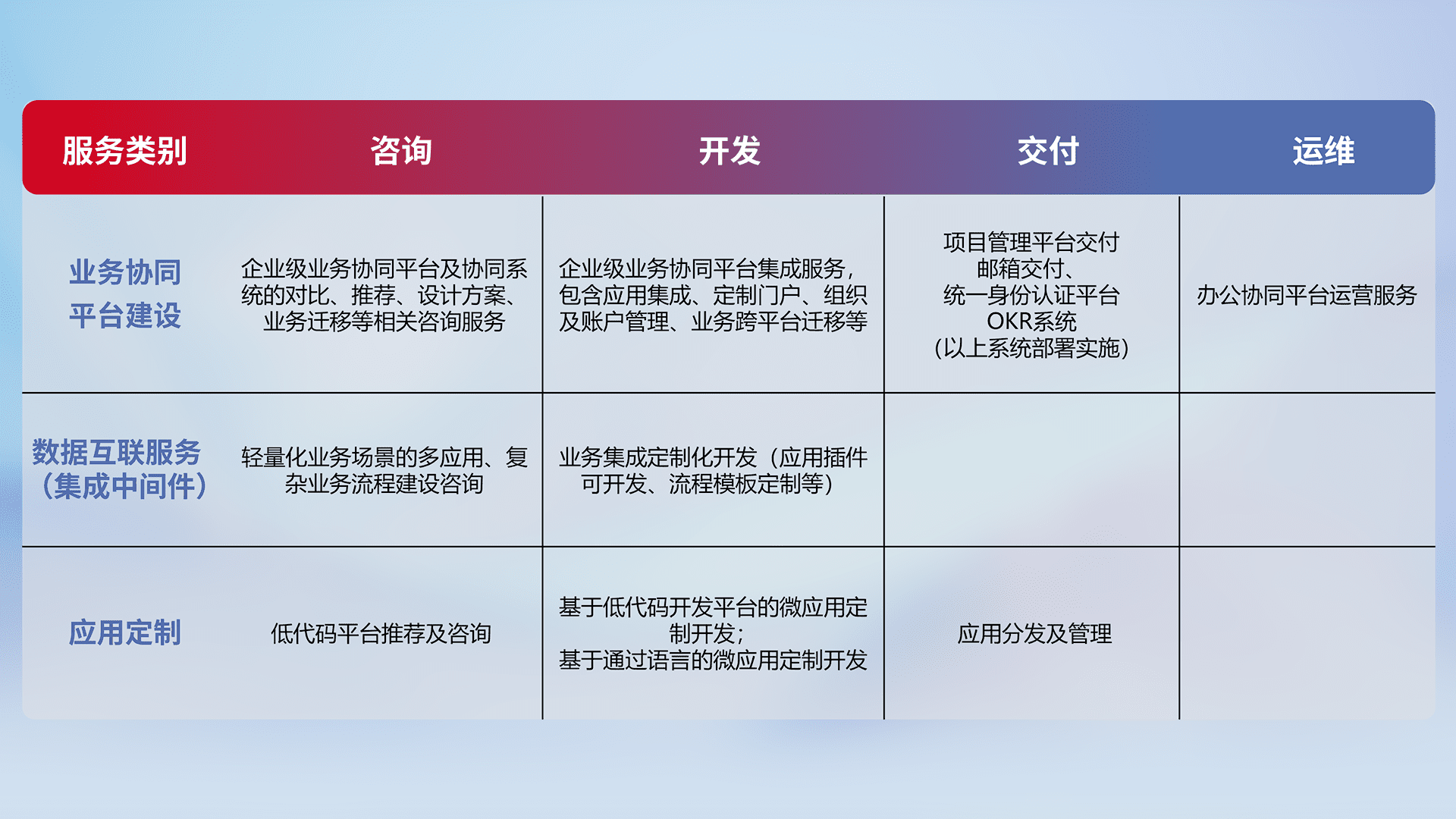 针对钉钉、、、企微、、IDaas等平台级产品提供产品的规划、、方案、、、交付、、、定制化开发等服务,,,,实现如统一协同办公、、智能客户服务、、混合会议管理、、智能数据查询、、、、等业务场景,,,实现数字化转型。。